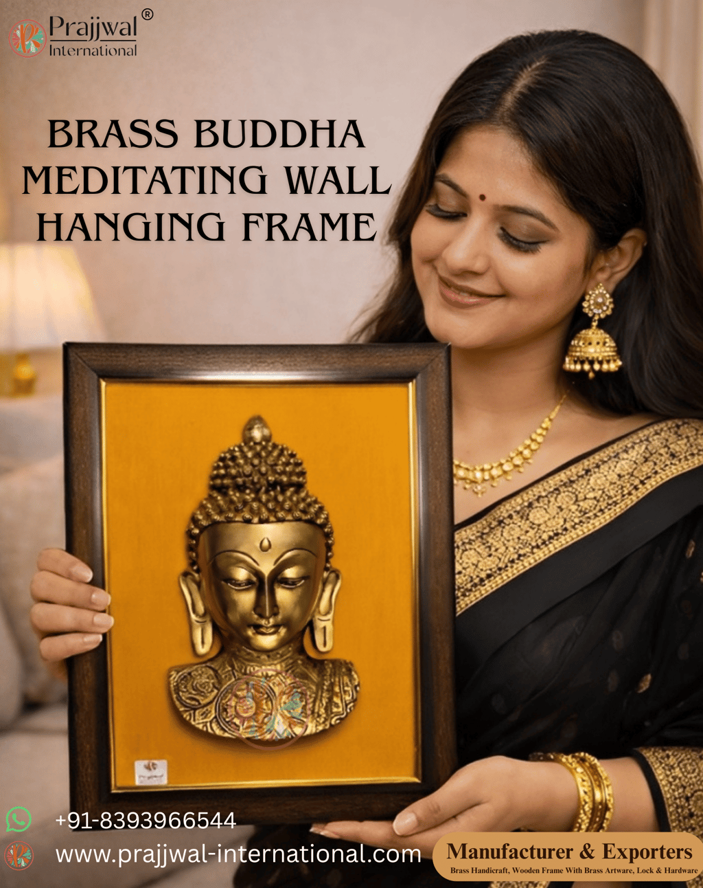 FeatureDetailsProduct NameBrass Buddha Meditating Wall Hanging FrameFrame Size14 × 18 InchesWeight2.8 Kg ApproxMaterialPure Brass with Wooden FrameFinishPremium Antique PolishUsageWall Décor, Meditation Rooms, Home Temples, Offices, GiftingPackagingSafe Export PackingCustomizationAvailable on Bulk OrdersManufacturer & ExporterPrajjwal International, Aligarh (India)