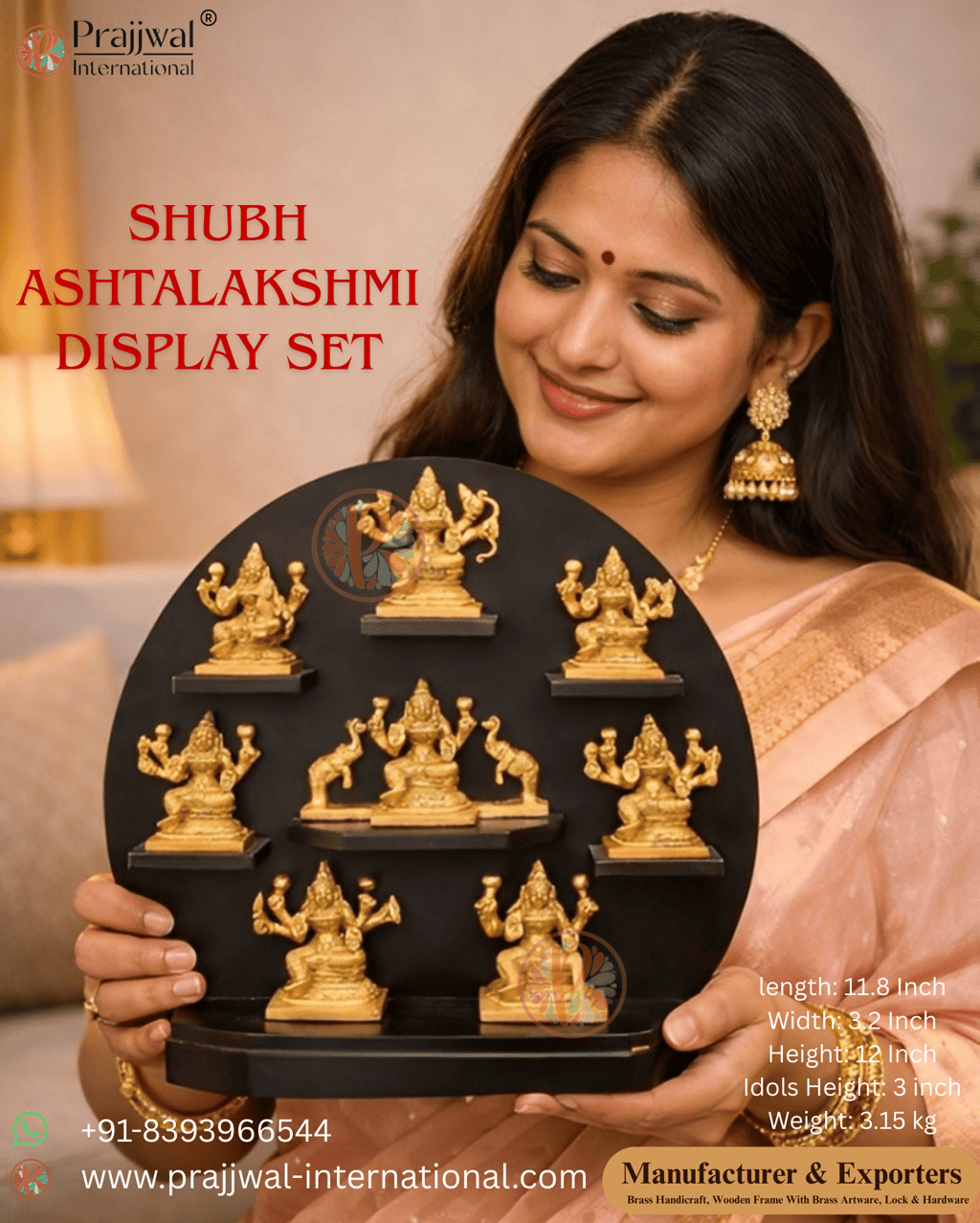 Shubh Ashtalakshmi Display Set is a beautifully handcrafted pure brass idol set featuring the eight divine forms of Goddess Lakshmi. With a premium antique gold finish and a solid 3.15 kg weight, this elegant display set brings wealth, peace, and prosperity to homes, offices, temples, and gifting spaces. Manufactured and exported by Prajjwal International, Aligarh (India). ๐ Contact: +91 8393966544 ๐ www.prajjwal-international.com